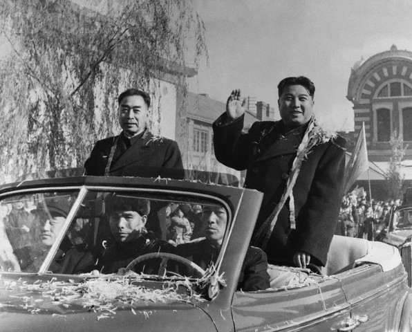 Prime Minister Kim Il Sung (right) of Communist North Korea and Chinese Premier Zhou Enlai wave to crowds after arriving in Beijing on a state visit.