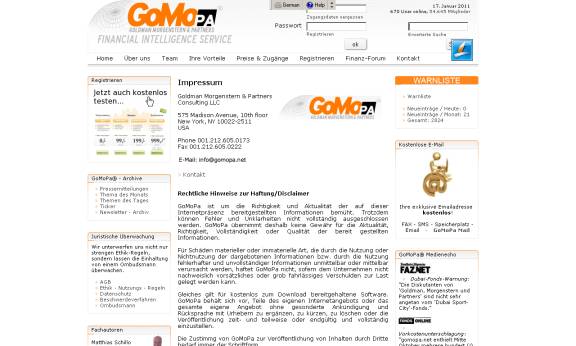 Seit einigen Tagen ist die Internetseite http://www.gomopa.net offline, und es kursieren Gerüchte über finanzielle Unregelmäßigkeiten. Immer wieder ist Gomopa in juristische Streitigkeiten verwickelt. In einer einstweiligen Verfügung des Landgerichts Berlin vom 31. August (Az.: 27 O 658/10) ist das Unternehmen aufgefordert worden, nicht länger Falschinformationen über den Kasseler Immobilienhändler Immovation AG und seinen Finanzvorstand Lars Bergmann zu verbreiten. „Gomopa hat seinen Firmensitz bewusst in New York, weil die Firma dort presserechtlich nicht belangt werden kann“, sagte ein Kenner des Unternehmens der F.A.Z.