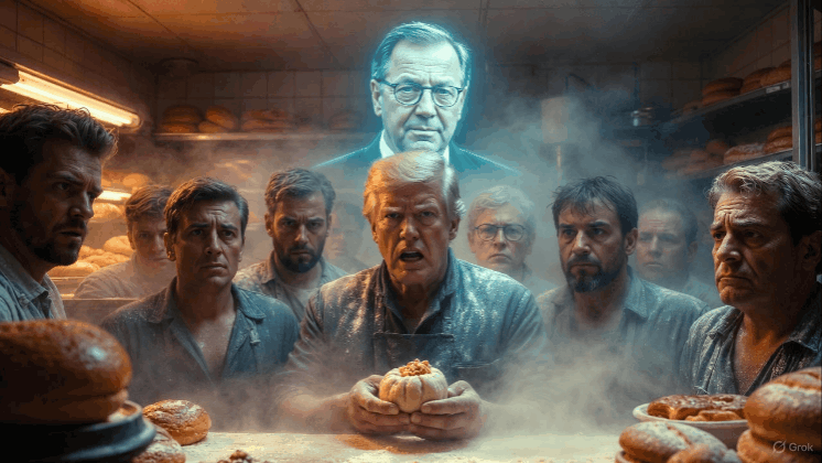 Klaus Schwab’s hologram glitches in: “Great Reset: You’ll own no bakery… and be happy eating crickets!” The Gray Mercedes amphibiously rams the counter: “Violation of EU baking regs – no clones in the kitchen!”